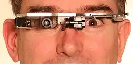 An EyeTap[1][2][3] is a concept for a wearable computing device that is worn in front of the eye that acts as a camera to record the scene available to the eye as well as a display to superimpose computer-generated imagery on the original scene available to the eye.[3][4] This structure allows the user's eye to operate as both a monitor and a camera as the EyeTap intakes the world around it and augments the image the user sees allowing it to overlay computer-generated data over top of the normal world the user would perceive.