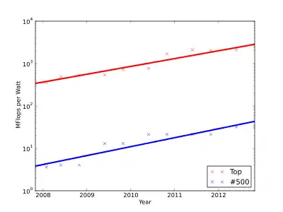 In computing, performance per watt is a measure of the energy efficiency of a particular computer architecture or computer hardware. Literally, it measures the rate of computation that can be delivered by a computer for every watt of power consumed. This rate is typically measured by performance on the LINPACK benchmark when trying to compare between computing systems: an example using this is the Green500 list of supercomputers. Performance per watt has been suggested to be a more sustainable measure of computing than Moore's Law.[1]