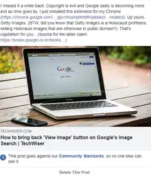 - Gibbs, Samuel (January 13, 2015). "Facebook tackles graphic videos and photos with 'are you sure?' warnings". The Guardian. Archived from the original on August 19, 2017. Retrieved June 3, 2017.
