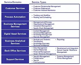 Each Service Domain is decomposed into Service Types. For example, the three Service Types associated with the Customer Services Domain are: Customer Preferences; Customer Relationship Management; and Customer Initiated Assistance. And each Service Type is decomposed further into components. For example, the four components within the Customer Preferences Service Type include: Personalization; Subscriptions; Alerts and Notifications; and Profile Management.[7]