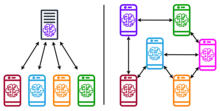 The way the statistical local outputs are pooled and the way the nodes communicate with each other can change from the centralized model explained in the previous section. This leads to a variety of federated learning approaches: for instance no central orchestrating server, or stochastic communication.[14]
