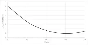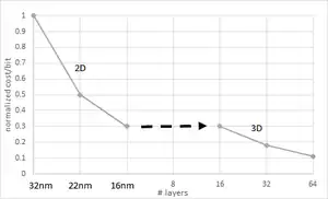 The wafer cost of a 3D NAND is comparable with scaled down (32 nm or less) planar NAND flash.[91] However, with planar NAND scaling stopping at 16 nm, the cost per bit reduction can continue by 3D NAND starting with 16 layers. However, due to the non-vertical sidewall of the hole etched through the layers; even a slight deviation leads to a minimum bit cost, i.e., minimum equivalent design rule (or maximum density), for a given number of layers; this minimum bit cost layer number decreases for smaller hole diameter.[92]