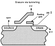 To erase a NOR flash cell (resetting it to the "1" state), a large voltage of the opposite polarity is applied between the CG and source terminal, pulling the electrons off the FG through Fowler–Nordheim tunneling (FN tunneling).[78] This is known as Negative gate source source erase. Newer NOR memories can erase using negative gate channel erase, which biases the wordline on a NOR memory cell block and the P-well of the memory cell block to allow FN tunneling to be carried out, erasing the cell block. Older memories used source erase, in which a high voltage was applied to the source and then electrons from the FG were moved to the source.[79][80] Modern NOR flash memory chips are divided into erase segments (often called blocks or sectors). The erase operation can be performed only on a block-wise basis; all the cells in an erase segment must be erased together.[81] Programming of NOR cells, however, generally can be performed one byte or word at a time.