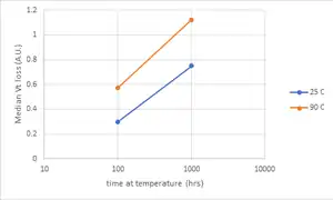 Data stored on flash cells is steadily lost due to electron detrapping. The rate of loss increases exponentially as the absolute temperature increases. For example: For a 45 nm NOR flash, at 1000 hours, the threshold voltage (Vt) loss at 25 deg Celsius is about half that at 90 deg Celsius.[94]