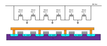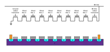 NAND flash also uses floating-gate transistors, but they are connected in a way that resembles a NAND gate: several transistors are connected in series, and the bit line is pulled low only if all the word lines are pulled high (above the transistors' VT). These groups are then connected via some additional transistors to a NOR-style bit line array in the same way that single transistors are linked in NOR flash.