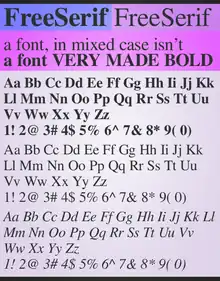 The family includes three faces: FreeMono, FreeSans, and FreeSerif, each in four styles (Regular, Italic/Oblique, Bold, and Bold Italic/Oblique).