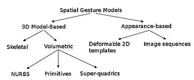 Some literature differentiates 2 different approaches in gesture recognition: a 3D model-based and an appearance-based.[31] The foremost method makes use of 3D information on key elements of the body parts in order to obtain several important parameters, like palm position or joint angles. Approaches derived from it such as the volumetric models have proven to be very intensive in terms of computational power and require further technological developments in order to be implemented for real-time analysis. Alternately, appearance-based systems use images or videos for direct interpretation. Such models are easier to process, but usually lack the generality required for human-computer interaction.