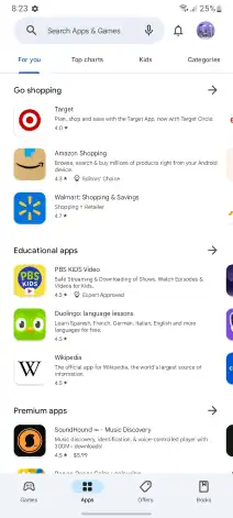 Apart from searching for content by name, apps can also be searched through keywords provided by the developer.[58] When searching for apps, users can press on suggested search filters, helping them to find apps matching the determined filters.[59] For app discoverability, Google Play Store consists of lists featuring top apps in each category, including "Top Free", a list of the most popular free apps of all time; "Top Paid", a list of the most popular paid apps of all time; "Top Grossing", a list of apps generating the highest amounts of revenue; "Trending Apps", a list of apps with recent installation growth; "Top New Free", a list of the most popular new free apps; "Top New Paid", a list of the most popular new paid apps; "Featured", a list of new apps selected by the Google Play team; "Staff Picks", a frequently updated list of apps selected by the Google Play team; "Editors' Choice", a list of apps considered the best of all time; and "Top Developer", a list of apps made by developers considered the best.[60] In March 2017, Google added a "Free App of the Week" section, offering one normally paid app for free.[61][62] In July 2017, Google expanded its "Editors' Choice" section to feature curated lists of apps deemed to provide good Android experiences within overall themes, such as fitness, video calling, and puzzle games.[63][64]