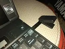 The HP OmniBook 300 (OB300) is a subnotebook released in 1993 as one of the first models in the OmniBook line. It weighed only 2.9 pounds and measured 1.4 × 6.4 × 11.1 inches. It is powered by an AMD 386SX-LV processor, featured a full-size keyboard, a pop-up computer mouse (The same pop-up mouse was also used in OmniBook 800CT; see the image above), and a 9-inch VGA screen.[48][49][50] Due to storage limitations, the OmniBook 300 included both Microsoft Excel and Microsoft Word pre-installed in ROM, which was and still remains unusual to this day.[51] It had two PCMCIA slots for additional memory, modem, network cards or other peripherals. One of its outstanding features was a technology known as "Instant On". It was sold in three storage configurations: no mass storage (F1030A at US$1,515), 10 MB flash memory disk (F1031A at US$2,375), or 40 MB hard drive (F1032A at US$1,950). Compared to the hard drive, the flash memory disk reduced the weight and storage capacity but increased battery life. It came with slimmed-down copies of MS-DOS 5.0 and Windows 3.1. The "International English" version of the OmniBook 300 used code page 850 (rather than the more common code page 437) as hardware code page.