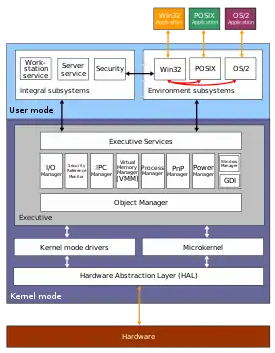 The Windows NT kernel has a HAL in the kernel space between hardware and the executive services that are contained in the file NTOSKRNL.EXE[2][3] under %WINDOWS%\system32\hal.dll. This allows portability of the Windows NT kernel-mode code to a variety of processors, with different memory management unit architectures, and a variety of systems with different I/O bus architectures; most of that code runs without change on those systems, when compiled for the instruction set applicable to those systems. For example, the SGI Intel x86-based workstations were not IBM PC compatible workstations, but due to the HAL, Windows 2000 was able to run on them.[4]