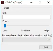 The minimalist GUI of the tool makes it user friendly and easy to control. The basic routine of an attack is to input the URL of the website which is to be attacked, and set the power option on low, medium or high. The power option sets the request velocity with low at two requests per second, medium at four and high at eight requests per second. Then a booster file is added which uses .hoic extension to define dynamic request attributes, launch attacks on multiple pages within the same website and help evade some defense filters. The attack is then launched by pressing the red button in the GUI labelled as "Fire Teh Lazer".[13]