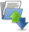 Desktop icons for file/data transfer, clock/awaiting, and running a program.
