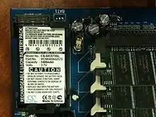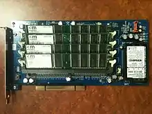 The i-RAM[1] was a PCI card-mounted, battery-backed RAM disk that behaved and was marketed as a solid-state storage device. It was produced by Gigabyte and released in June 2005,[2] at a time when genuine solid-state storage solutions were generally still less affordable than an i-RAM product with superficially similar capabilities. The i-RAM utilized DRAM, a type of volatile memory, and was equipped with a lithium-ion battery to provide backup power. This backup power was necessary only when the host computer was either unplugged or completely powered down. Under normal conditions, the i-RAM could draw sufficient power from the PCI bus for RAM refresh, as the PCI bus maintains standby power even when an ATX system is shut down. However, the preservation of the DRAM's contents was limited to a duration of 10 to 16 hours, depending on the configuration, after the power supply was completely interrupted.