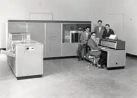 The IBM 305 RAMAC was the first commercial computer that used a moving-head hard disk drive (magnetic disk storage) for secondary storage.[1] The system was publicly announced on September 14, 1956,[2][3] with test units already installed at the U.S. Navy and at private corporations.[2] RAMAC stood for "Random Access Method of Accounting and Control",[4] as its design was motivated by the need for real-time accounting in business.[5]