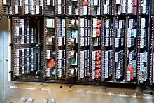 SLT uses dual diode chips and individual transistor chips each approximately 0.025 inches (0.64 mm) square.[3]: 15 The chips are mounted on a 0.5 inches (13 mm) square substrate with silk-screened resistors and printed connections. The whole is encapsulated to form a 0.5 inches (13 mm) square module. Up to 36 modules are mounted on each card, though a few card types had just discrete components and no modules. Cards plug into boards which are connected to form gates which form frames.[3]: 15
