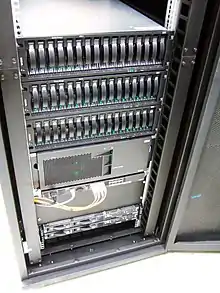 The IBM XIV Storage System was configured as cabinet-size solution and designed to work well in cloud and virtualized environments. The last XIV Gen3 model offers 2, 3, 4 or 6 TB drives, providing up to 485 TB of usable capacity per rack. SSD caching (available as an option) adds up to 12 TB of management-free high-performance data caching capability to the entire array. The system can also connect to external storage via Fibre Channel (8 Gbit/s) and iSCSi (1 or 10 Gbit/s).[25] The XIV line was replaced by IBM FlashSystem line.[26]