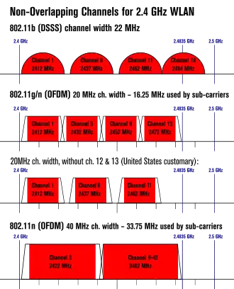 - Overlaps noted with an asterisk (*) indicate overlap only in the 22 MHz width, while 802.11g only requires 20 MHz (the actual occupied bandwidth is even lower, 16.25 MHz). As a result, such overlaps have minimal performance implications.