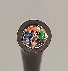 The Category 7 cable standard was ratified in 2002, and primarily introduced to support 10 gigabit Ethernet over 100 m of copper cabling.[2] It contains four twisted copper wire pairs, just like the earlier standards, terminated either with GG45 electrical connectors or with TERA connectors rated for transmission frequencies of up to 600 MHz.[3]