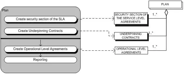 The Plan sub-process contains activities that in cooperation with service level management lead to the (information) Security section in the SLA. Furthermore, the Plan sub-process contains activities that are related to the underpinning contracts which are specific for (information) security.