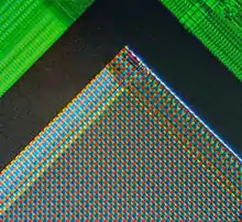 - Integral color sensors[15] use a color filter array fabricated on top of a single monochrome CCD or CMOS image sensor. The most common color filter array pattern, the Bayer pattern, uses a checkerboard arrangement of two green pixels for each red and blue pixel, although many other color filter patterns have been developed, including patterns using cyan, magenta, yellow, and white pixels.[16] Integral color sensors were initially manufactured by transferring colored dyes through photoresist windows onto a polymer receiving layer coated on top of a monochrome CCD sensor.[17] Since each pixel provides only a single color (such as green), the "missing" color values (such as red and blue) for the pixel are interpolated using neighboring pixels.[18] This processing is also referred to as demosaicing or de-bayering.