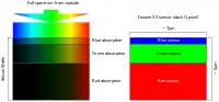 - Foveon X3 sensor, using an array of layered pixel sensors, separating light via the inherent wavelength-dependent absorption property of silicon, such that every location senses all three color channels. This method is similar to how color film for photography works.