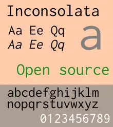Inconsolata is an open-source font created by Raph Levien and released under the SIL Open Font License. It is a humanist lineal monospaced font designed for source code listing, terminal emulators, and similar uses. It was influenced by the proprietary Consolas monospaced font, designed by Lucas de Groot, the proportional Avenir and IBM's classic monospaced Letter Gothic.