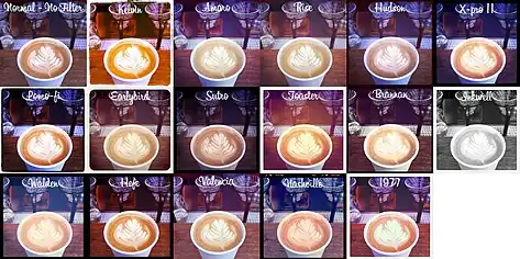 Instagram offers a number of photographic filters that users can apply to their images. In February 2012, Instagram added a "Lux" filter, an effect that "lightens shadows, darkens highlights and increases contrast".[168][169] In December 2014, Slumber, Crema, Ludwig, Aden, and Perpetua were five new filters added to the Instagram filter family.[170]