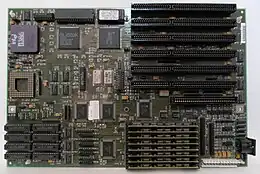 Example of a motherboard with an i386 microprocessor (33 MHz), 64 KiB cache (25 ns; 8 chips in the bottom left corner), 2 MiB DRAM (70 ns; 8 SIMMs to the right of the cache), and a cache controller (Austek A38202; to the right of the processor)