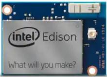 The Intel Edison is a computer-on-module that was offered by Intel as a development system for wearable devices[2] and Internet of Things devices. The system was initially announced to be the same size and shape as an SD card and containing a dual-core Intel Quark x86[3] CPU at 400 MHz communicating via Bluetooth and Wi-Fi.[4][5] A later announcement changed the CPU to a 500 MHz Silvermont dual-core Intel Atom CPU,[6] and in September 2014 a second version of Edison was shown at IDF, which was bigger and thicker than a standard SD card.[7][8][9]