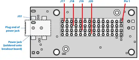 The table below lists the signals from the Edison Module that are routed to the four breakout connector (J17-J20). The figure below shows the location of each connector.