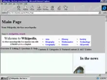 Microsoft Internet Explorer 3 (IE3) is the third, and by now, discontinued, version of the Internet Explorer graphical web browser which was announced in March 1996, and was released on August 13, 1996 by Microsoft for Microsoft Windows and on January 8, 1997 for Apple Mac OS (see IE for Mac). It began serious competition against Netscape Navigator in the first Browser war.[1] It was Microsoft's first browser release with a major internal development component.[2] It was the first more widely used version of Internet Explorer, although it did not surpass Netscape or become the browser with the most market share. During its tenure, IE market share went from roughly 3–9% in early 1996 to 20–30% by the end of 1997.[3][4][5] In September 1997 it was superseded by Microsoft Internet Explorer 4.