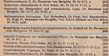 Von Neumann's habilitation was completed on December 13, 1927, and he began to give lectures as a Privatdozent at the University of Berlin in 1928.[45] He was the youngest person elected Privatdozent in the university's history.[46] He began writing nearly one major mathematics paper per month.[47] In 1929, he briefly became a Privatdozent at the University of Hamburg, where the prospects of becoming a tenured professor were better,[48] then in October of that year moved to Princeton University as a visiting lecturer in mathematical physics.[49]