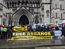 On 11 April 2019, Assange's asylum was withdrawn following a series of disputes with Ecuadorian authorities.[15] The police were invited into the embassy and he was arrested.[16] He was found guilty of breaching the Bail Act and sentenced to 50 weeks in prison.[17] The U.S. government unsealed an indictment charging Assange with conspiracy to commit computer intrusion related to the leaks provided by Manning.[18] In May 2019 and June 2020, the U.S. government unsealed new indictments against Assange, charging him with violating the Espionage Act of 1917 and alleging he had conspired with hackers.[19][20][21] Assange has been incarcerated in HM Prison Belmarsh in London since April 2019, as the United States government's extradition effort is contested in the British courts.[22][23][24]
