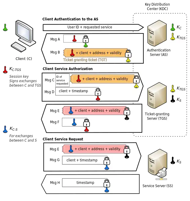 - Message E: From the previous step (the Client-to-server ticket, encrypted using service's Secret key by the TGS).