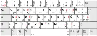 The QWERTZ layout is the normal keyboard layout in Germany, Austria and Switzerland. It is also fairly widely used in Czechia, Slovakia and other parts of Central Europe. The main difference between it and QWERTY is that Y and Z are swapped, and some special characters such as brackets are replaced by diacritical characters like Ä, Ö, Ü, ß. In Czechia and Slovakia diacritical characters like Ě, Š, Č, Ř, Ž, Ý, Á, Í also replace numbers. Caps lock can be a shift lock as in AZERTY (see below).