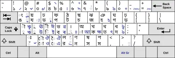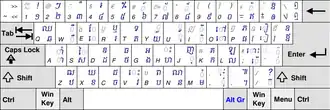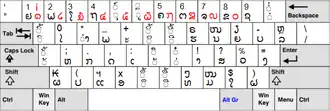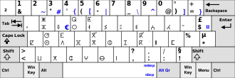 In the keyboard charts listed below, the primary letters or characters available with each alphanumeric key are often shown in black in the left half of the key, whereas characters accessed using the AltGr key appear in blue in the right half of the corresponding key. Symbols representing dead keys usually appear in red.