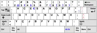 Turkmen keyboards use a layout known as ÄWERTY (/æˈvɜːrtiː/ av-UR-tee), where Ä appears in place of Q above A, Ü appears in place of X below S, Ç appears in place of C, and Ý appears in place of V, with C, Q, V, and X not being accessible at all. It is supported by Microsoft Windows (Vista and later only).[29]