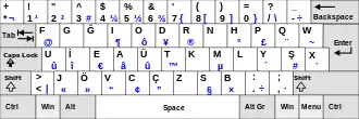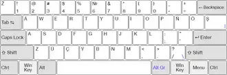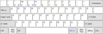 Azerbaijani keyboards use a layout known as QÜERTY, where Ü appears in place of W above S, with W not being accessible at all. It is supported by Microsoft Windows.[29]
