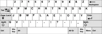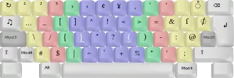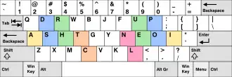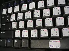 Mixed hardware-to-software keyboard extensions exist to overcome the above discrepancies between functional and visual layouts. A keyboard overlay[24] is a plastic or paper masks that can be placed over the empty space between the keys, providing the user with the functional use of various keys. Alternatively, a user applies keyboard stickers with an extra imprinted language alphabet and adds another keyboard layout via language support options in the operating system.[25] The visual layout of any keyboard can also be changed by simply replacing its keys or attaching labels to them, such as to change an English-language keyboard from the common QWERTY to the Dvorak layout, although for touch typists, the placement of the tactile bumps on the home keys is of more practical importance than that of the visual markings.