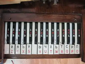 The earliest mechanical keyboards were used in musical instruments to play particular notes. With the advent of the printing telegraph, a keyboard was needed to select characters. Some of the earliest printing telegraph machines either used a piano keyboard outright or a layout similar to a piano keyboard.[16][17] The Hughes-Phelps printing telegraph piano keyboard laid keys A-N in left-to-right order on the black piano keys, and keys O-Z in right-to-left order on the white piano keys below.