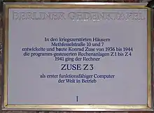 Plaque commemorating Zuse's work, attached to the ruin of Methfesselstraße 7, Berlin