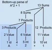At step 6 in an example parse, only "A*2" has been parsed, incompletely. Only the shaded lower-left corner of the parse tree exists. None of the parse tree nodes numbered 7 and above exist yet. Nodes 3, 4, and 6 are the roots of isolated subtrees for variable A, operator *, and number 2, respectively. These three root nodes are temporarily held in a parse stack. The remaining unparsed portion of the input stream is "+ 1".