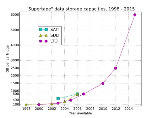 | Native capacity | 100 GB | 200 GB | 400 GB | 800 GB | 1.5 TB [19] | 2.5 TB[20][37] | 6.0 TB[17][21][37] | 9.0 TB | 12 TB [21][37] | 18 TB[24][28][37][23] |