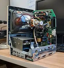 Inside a Macintosh Plus; the cathode-ray tube and its associated circuitry on its right side take up a considerable amount of interior space.