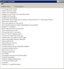 When it is invoked, one can choose the name of the Windows 3.1 application program image file using the "Choose Program" option on the "File" menu. After the program image file is chosen, Make Compatible by default displays a list of five options that can be set to alter the behaviour of Windows for that program when it is executed:[1]