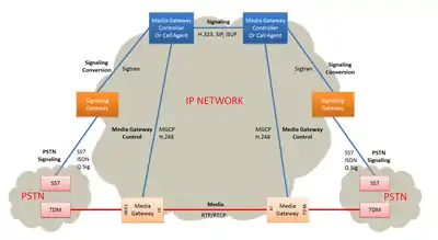 The media gateway control protocol architecture is a methodology of providing telecommunication services using decomposed multimedia gateways for transmitting telephone calls between an Internet Protocol network and traditional analog facilities of the public switched telephone network (PSTN).[1] The architecture was originally defined in RFC 2805 and has been used in several prominent voice over IP (VoIP) protocol implementations, such as the Media Gateway Control Protocol (MGCP) and Megaco (H.248), both successors to the obsolete Simple Gateway Control Protocol (SGCP).