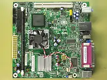 Mini-ITX is a 170 mm × 170 mm (6.7 in × 6.7 in) motherboard form factor developed by VIA Technologies in 2001.[1] Mini-ITX motherboards have been traditionally used in small-configured computer systems. Originally, Mini-ITX was a niche standard designed for fanless cooling with a low power consumption architecture, which made them useful for home theater PC systems, where fan noise can detract from the cinema experience.