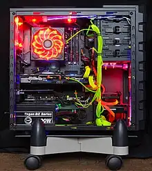 Case modding may range from simple case (or chassis) painting, to extensive case modifications with custom-fabricated pieces. The terms modding and modder have expanded to encompass a broad range of customization by personal-computer enthusiasts, especially in gaming PCs, including: custom and homemade hard- and soft-line liquid cooling loops; installation of LED strips and other lighting effects; replacement of stock cooling fans with high-performance ones (on CPU coolers, power supplies, cases, drive bays, and other components); "delidding" of CPUs and GPUs to replace their stock thermal paste and pads with high-thermal-conductivity ones; addition of individually sleeved (and often color-coordinated) cabling; replacement of various heat sinks with custom liquid-cooling water blocks on components normally air-cooled (e.g. RAM, GPUs, and SSDs); addition of new components not usually found in PCs, such as electronic timers or temperature and humidity alarms; custom soldering to replace or change the behavior of components; expansion of the motherboard's capabilities with PCIe add-in cards and risers (the latter also used to mount graphics cards sideways to show them off better); addition of server hardware into a consumer-grade system; and extensive overclocking through detailed benchmarking that seeks to squeeze out every last percentage of performance improvement without the system becoming unstable.
