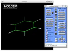 ![]() Molden running under Linux, showing the structure of benzene. | |