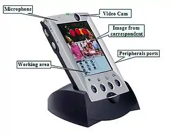 The first integration between mobile phone and Palm (PDA Personal Device Assistant) occurred in 1999, as a result of an Italian–lead project[1] submitted to the action line V1.1 CPA1 "Integrated application platforms and services" 5th Framework Program[2] of the European Community (project number IST1999-11100).[3][4][5][6][7][8] The project, called MTM (Multimedia Terminal Mobile), was a multimedia platform, including both phone and PDA features; it also integrated the first miniature camera and a unidirectional microphone for video conferencing and commands interpretation through voice recognition. The creator and coordinator of the project, Alessandro Pappa,[9] worked in a team with other European partners: